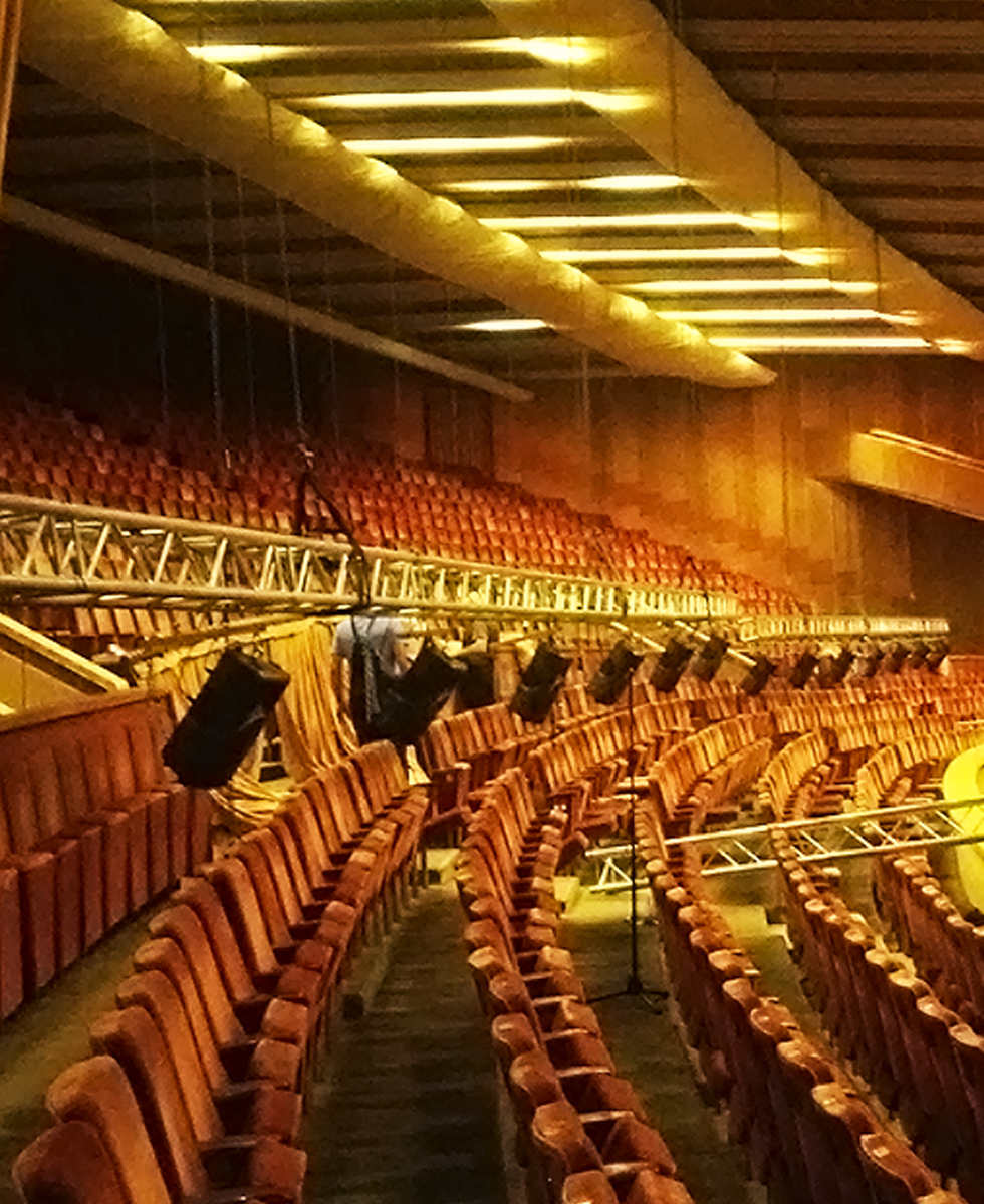 In most locations acoustic reflection panels could be positioned to channel the music to the audience. This is however not desirable in Sala Palatului, for a variety of practical reasons, and as the George Enescu festival only takes up the room for a couple of days every 2 years, a large structural change in the room is not an option. Luckily acoustic treatment can also be achieved by installing an electro-acoustic system. Commissioned by rental company Paradigma, FACE has been the festival’s supplier of a mobile Multi-Channel-reverberation (MCR) system for the past editions. For this specific event a field of 64 MCR speakers was placed across the room’s ceiling, along with 64 Audio Technica AT4022 omni-directional microphones. The audio which is captured by the microphones is processed by Peavey Media Matrix’s “Nion”, and then translated back to it’s corresponding speaker.